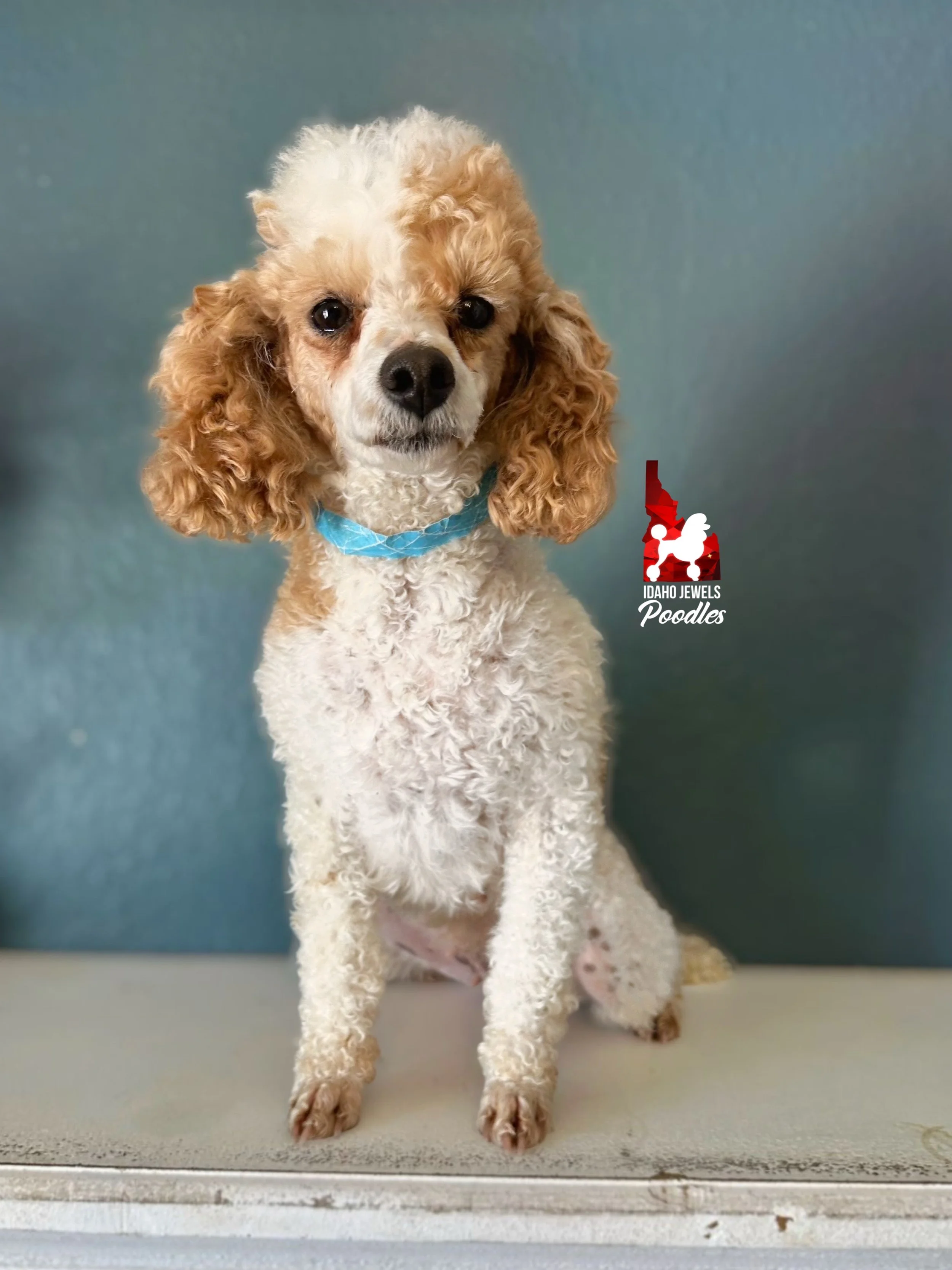 Elle is a super sweet red parti miniature poodle girl. She loves to lay out in the sunshine, and gets along well with people. She is very friendly.
